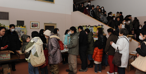 [사진]재해 발생 후 하룻밤을 보낸 지난달 12일 오전 6시 35분 센다이시 창가학회 도호쿠문화회관에서 이재민들이 주먹밥과 물을 받고 있다. 지난달 12일 오전 기준으로 585명이 도호쿠문화회관에 대피했다.