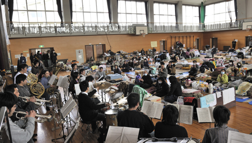 【미야기】창가학회 도호쿠음악대가 지난 4월 3일, 미야기현 이시노마키시에 있는 대피소에서 이재민들에게 힘을 주고 싶다는 마음을 담아 연주회를 열었다.