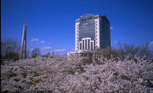 이외에도 올해 소카대학교는 박사 학위 취득자를 10명 배출했다. 벚꽃이 만개한 일본 소카대학교 본관 전경. 눈덮인 산 정상에 우뚝 솟아 있는 것 같다.