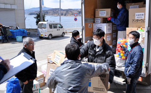 [사진_위] 지난달 28일, 미야기현 미나미산리쿠 시내에 많은 이재민을 위한 창가학회 구호품이 각지 대피소로 도착했다.