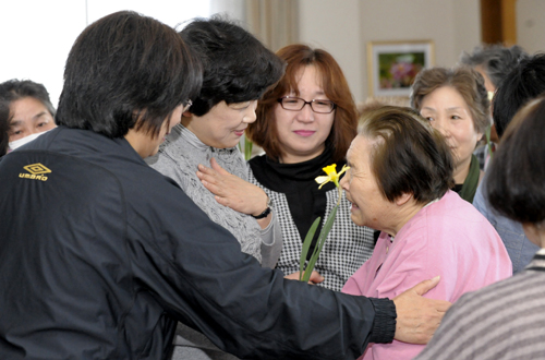 한편, 이와테현 미야코시를 비롯한 노다마을, 다노하타마을이 동일본대지진 이후 처음으로 좌담회를 열어 지역의 빠른 복구를 위해 학회원이 힘을 합쳐 전진하자고 굳게 다짐했다. 스기모토 부인부장(왼쪽 둘째)이 오후나토 동지 한사람 한사람을 격려하고 있다.