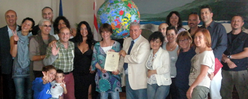 불가레시 시장은 2009년 2월, 인접한 마르차나 마리나시에서 개최한 환경전 ‘변혁의 종자지구헌장과 인간의 가능성’을 관람해 깊이 공감했다. 그리고 환경교육에 탁월한 리더십을 발휘한 SGI 회장을 진심으로 상찬해 ‘명예시민’ 칭호를 수여하기로 스스로 제안했다. 시의회가 만장일치로 의결해 SGI 회장에게 수여했다. 지난달 7일, 마르차나시청에서 불가레시 시장(가운데 왼쪽)이 리테라 이탈리아SGI 부이사장에게 ‘명예시민증’을 전달했다.