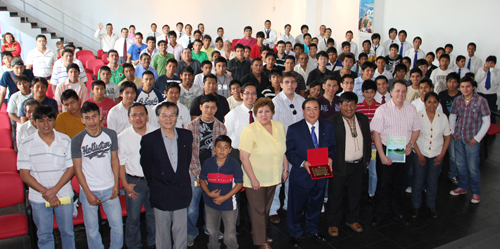 【종합】볼리비아 추키사카주 자치단체연합이 지난달 24일(현지시각), 산타크루스시 프란스 타마요대학교에서 열린 남자부 결성 60주년을 기념하는 대회에서 세계평화를 위한 공헌을 기려 이케다(池田) SGI 회장을 특별현창해 다케노 볼리비아SGI 이사장이 SGI 회장을 대리해 증서를 받았다. 수여식에는 프안 카를로스 레온 자치단체연합회 회장을 비롯해 비루스알대학교 호세 안토니오 데차살 총장이 참석했다.