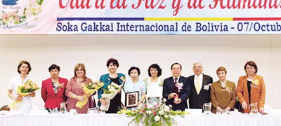 볼리비아SGI 여성평화회의 결성 10주년을 기념해 지난해 10월 7일부터 이틀간 열린 볼리비아 여성서밋은 현창 세 개를 수여했다. 빈첸티 산타크루스주지사 부인(왼쪽 셋째), 리베로‘코차밤바주 사법윤리위원회’부위원장(왼쪽 넷째), 히메네스 볼리비아사법학아카데미 회장(오른쪽 셋째), 후스티니아노 국립마리스칼수크레교육대학교 총장(맨 오른쪽) 등이 축하했다.