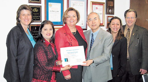 로우랜드통일학교구 오토 교육장(왼쪽 셋째)과 갈레고스 위원장(맨 왼쪽)이 이케다 SGI회장 대리인 나가시마 미국SGI이사장(왼쪽 넷째)에게 SGI회장 내외의 '명예총교장' 증서를 전달하고 축하했다.