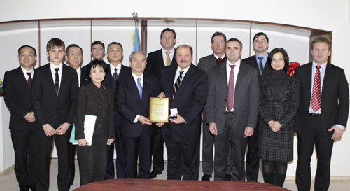 미콜라 쿨리니치 주일본 대사가 이케다 SGI 회장이 펼친 평화투쟁의 역사를 언급한 뒤, SGI 회장을 대신한 하라다 SGI 회장대행에게 훈장과 증서를 전달했다.