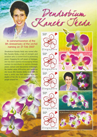 【싱가포르】 싱가포르 우체국이 ‘가네코란(蘭)’ 명명 5주년을 기념해 우표를 발행했다. 싱가포르SGI가 기획한 이 우표에는 이케다 가네코 여사의 초상과 함께 연보라와 분홍빛을 띤 ‘가네코란’이 도안되었다.