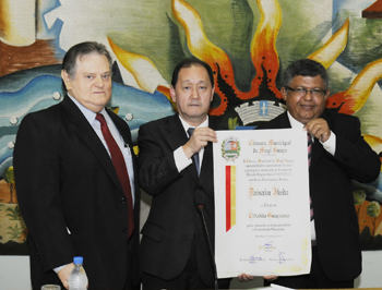 카를루스 도니제티 다 코스타 시의원이 SGI 회장 대리인 이사미 브라질SGI 부이사장에게 ‘명예시민증’을 전달했다.