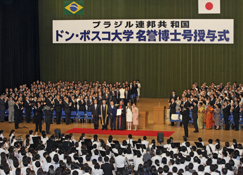 【도쿄】 브라질 동 보스쿠대학교가 지난달 22일, 도쿄 하치오지시에 있는 소카(創價)대학교 기념강당에서 이케다(池田) SGI 회장에게 ‘명예박사’ 학위를 수여했다. 이로써 전 세계에서 SGI 회장에게 수여된 명예학술칭호는 332개가 됐다.