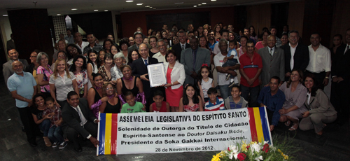 【종합】 브라질 이스피리투산투주가 지난달 28일(현지시간) 비토리아시에 있는 주의회의장에서 이케다(池田) SGI 회장에게 ‘명예주민’ 칭호를 수여했다.