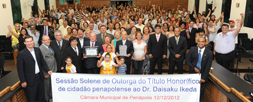 【상파울루】 브라질 상파울루주 페나폴리스시가 지난해 12월 12일 시의회의장에서 문화와 교육으로 평화와 인도주의를 세계에 넓힌 공헌을 기려 이케다 SGI 회장에게 명예시민증을 수여했다.