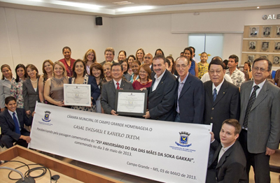 캄푸그란데시의회는 지난달 3일, ‘5·3’ 기념 경축의회를 시의회 회의장에서 열고, 이 자리에서 브라질SGI의 요시카와 주석부이사장과 나가타 총합방면부인부장에게 현창장을 전달했다.