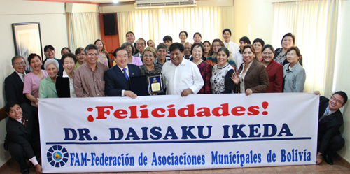 지난달 2일에는 볼리비아 자치단체협회연합회가 산타크루스 시내에서 SGI의 평화와 문화 그리고 교육 운동의 리더십을 기려 이케다 SGI 회장을 현창해, 프안 카를로스 레온 회장과 전국 자치 단체 대표가 수여식에 참석했다. 이번 수여는 볼리비아 전국 339곳을 대표하는 ‘최고영예’로, 이케다 SGI 회장을 대리한 볼리비아SGI 다케노 이사장에게 현창패를 전달했다. 후안 카를로스 레온 회장은 세계 식자들의 대담집 및 평화제언 등으로 이케다 SGI 회장의 평화 사상과 행동을 크게 공감해 이번 수여를 결정했다. 현창패에는 ‘절대적인 비폭력주의를 주장하며 평화 사회를 위한 발전과 시민의 향상을 위해 노력하고 평화와 문화 그리고 교육 운동을 추진하는 이케다 SGI 회장을 훌륭한 인물로 기려 이에 현창한다’ 하고 씌어 있다.