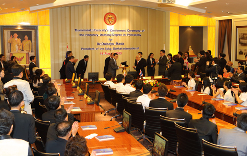 【방콕】 타이의 명문 국립 탐마삿대학교가 지난 14일 수도 방콕에 있는 타프라찬 캠퍼스에서 불법(佛法)의 인간주의를 기조로 타이와 일본의 문화 및 교육 교류에 다대한 공헌을 기려 이케다(池田) SGI 회장에게 ‘명예철학박사’ 학위를 수여했다.