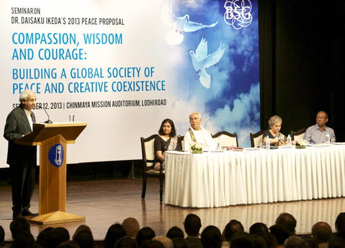 【뉴델리】 인도SGI가 지난달 12일 이케다 SGI 회장의 제38회 ‘SGI의 날’ 기념제언(올해 1월 발표)에 바탕을 둔 세미나를 수도 뉴델리에 있는 친마야미션강당에서 열었다.