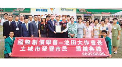 【세이쿄신문】이케다(池田) SGI 회장에게 세계 도시에서 수여한 ‘명예시민’ 칭호가 5백 개에 이르렀다. 5백번 째는 타이완 타이베이현 투청시다.