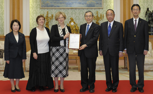 이날 수여식에서 스미르노바 부총장이 ‘수여사’를 낭독하고 이케다 SGI 회장을 대리한 소카대학교의 바바 총장에게 ‘명예박사’ 학위기와 기념품을 전달했다.