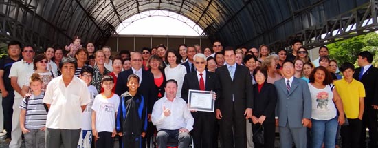 【폰타그로사】 지난달 18일, 브라질 파라나주 폰타그로사시의회가 창가학회 창립 83주년을 기념하는 경축의회에서 이케다 SGI 회장에게 ‘현창장’을 수여해 아리에우 마샤두 바르키 시의회의장을 비롯한 다니엘 미라 프라카로 시의회의원 그리고 브라질SGI 멤버 등 약 80명이 참석했다.