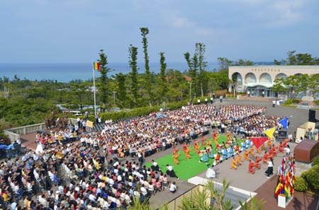 여자부 벗은 ‘류큐무용’을 선보였고 남자부와 대학부는 ‘창작 에이사(오키나와 전통예능)’를 선보였다. 이어서 나카무라 오키나와남자부장과 이시미네 오키나와여자부장이 “선생님이 여신 ‘인간혁명’ ‘영원평화’의 길을 전 세계로 넓히겠습니다!” 하고 ‘평화선언’을 했다.