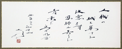 첫째는 “인재성을 구축하겠노라/ 결의하도다/ 은사가 떠난/ 아오바에 서서”라는 와카다. 협서에는 “센다이에서 쓰다” 하고 씌어 있다.(위 사진)