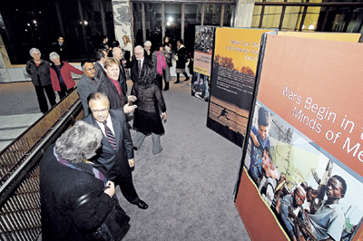 도다 제2대 회장의 ‘원수폭금지선언’ 50주년과 同국 비핵법 성립 20주년을 기념하는 전시에서는 핵 위협과 원수폭금지선언의 상황을 소개했다. 이날 초두리 前사무차장은 기조강연에서 “많은 젊은이들이 전시를 보기 바랍니다. 젊은 세대가 평화의 문화를 자신의 삶으로 받아들이는 것이 중요합니다” “이케다 SGI 회장은 평화의 문화를 전 세계로 넓히셨습니다. 회장의 평화제언에는 중요한 의견이 많이 있습니다. 유엔중심주의의 길을 넓히신 민간인은 SGI 회장 뿐입니다. 깊이 감사드립니다”라고 말했다.