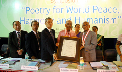 인도 첸나이에서 열린 수여식에서 세계시가협회 스리니바스 회장(왼쪽 넷째), 파도마나반 부회장(왼쪽 다섯째)이 대리인 동양철학연구소 가와다 소장(왼쪽 셋째)에게 '세계민중시인' 증서를 전달했다.
