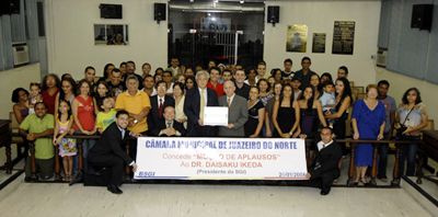 同시의 호나우두 의장은 “문화와 교육 추진으로 세계 평화의 구축을 위해 매진하는 SGI 회장의 사상과 행동 그리고 SGI의 이념을 브라질SGI 여러분을 통해 알 수 있었습니다.” “우리 시에 SGI 운동을 널리 알리고 싶다는 소망을 담아 시의회는 SGI 회장을 현창합니다!” 하고 말한 후, SGI 회장 대리 이사미 브라질SGI 부이사장에게 현창장을 건넸다.