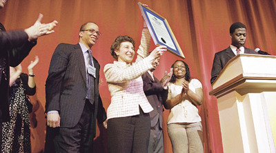 존슨 상급고문은 “차세대의 청년에게 인류를 위해 더욱 좋은 세계를 만들도록 가르치고, 정의와 평화의 세계 구축을 지향하는 SGI 회장의 모범적인 행동과 걸출한 리더십을 뉴욕 시민은 높이 평가합니다”라고 선언서를 낭독했다. 또 “SGI 회장의 평화 활동은 간디, 킹 박사와 어깨를 나란히 하는 것입니다. 박사가 내건 세계 평화의 꿈과 구상을 달성하는 것이 생애에 걸친 우리의 사명입니다!”라며, SGI 대표에게 선언서를 수여했다.