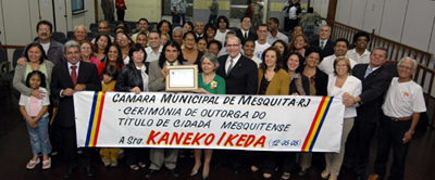 브라질 리우데자네이루주 메스쿠이타시가 이케다 가네코(池田香峯子) 여사에게 ‘명예시민증’을 수여했다.