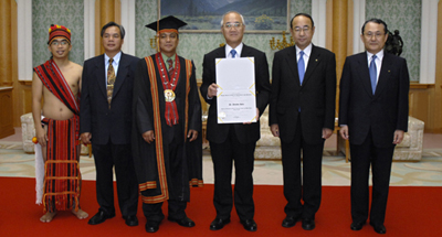수여식은 도쿄 하치오지시 소카대학교 본관에서 거행돼, 필리핀 국립이푸가우농림대학교의 세라핀 고하용 총장, 시루바노 마히오 고문, 에루피디오 바시리오 주니어 강사가 참석했다.