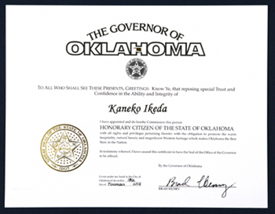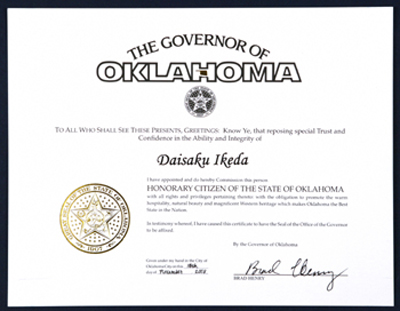 헨리 주지사가 서명한 증서에는 “SGI 회장 부부의 뛰어난 힘과 높은 정신을 각별히 신뢰해 오클라호마주 명예주민으로 임명합니다”라고 쓰여 있다.