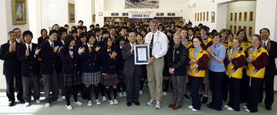수여식은 교육 교류를 위해 오사카 가타노시에 있는 간사이 소카학원을 방문한 팀분P-12학교 학생과 간사이 소카학원생의 교환회에서 열려 시오타 소카학원장에게 증서를 전달했다.