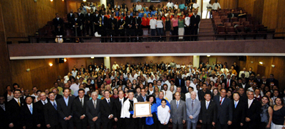 올리베이라 총장이 수여식에서 “사제불이 정신으로 평화를 위해 꿋꿋이 투쟁한 인물 이케다 박사에게 명예학술 칭호를 수여하게 된 일은, 우리에게 더할 나위 없는 기쁨이며 영예로운 역사적 장거입니다. 평화롭고 조화로운 사회를 창출하기 위해 인생을 바치고, 교육·환경보호·문화·인권 가치를 부흥하는 이케다 박사야말로 인류가 발전하는 길을 제시한 위인입니다. 인류의 새로운 미래를 향해 매진하는 이케다 박사와 SGI 여러분에게 진심으로 감사드립니다”라고 수여사를 낭독한 뒤, SGI 회장을 대리한 오바 SGI 이사장에게 명예학위기를 전달했다.