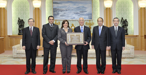증서에는 “귀하는 다문화 간에 식자와 민중에게 끊임없이 대화를 촉진하고 평화를 향한 마음을 세계적인 수준까지 이끌어 오셨습니다. 또 환경보호와 교육, 사상과 교양을 향상시켜 인류에 현저한 공헌과 발전을 동반해 반석 같은 평화문화를 구축했습니다. 모든 사람이 끊임없는 노력을 알고 있습니다”라고 씌어 있다.