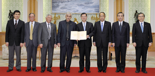 (사진 설명) 지난달 24일, 소카대학교 본관에서 피다예프 소장(왼쪽 넷째)이 SGI 회장을 대리한 이케다 히로마사 소카대학교 이사장(왼쪽 다섯째)에게 명예박사 학위기를 전달했다.