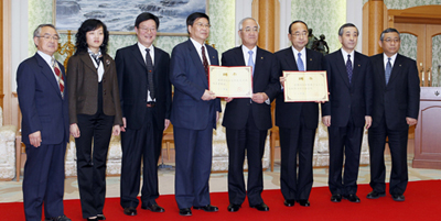 (사진설명) 중국 사립대 시안외사학원이 지난달 27일 소카대학교 본관에서 이케다 SGI 회장에게 ‘명예교수’칭호를 수여했다. 시안외사학원 두뤼칭 부총장(왼쪽 넷째)이 이케다 SGI 회장을 대리한 야마모토 소카대학교 총장에게 증서를 전달했다.