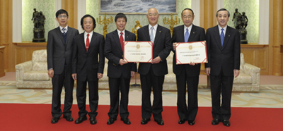 【사진 설명: 지난 10일 소카대학교 본관에서 왕화 광둥상학원 총장(왼쪽 셋째)이 이케다 SGI 회장 부부를 대리한 야마모토 소카대학교 총장에게 ‘명예교수’ ‘명예도서관장’ 증서를 전달했다.】