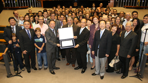 [사진 설명] 지난 5월 3일, 브라질 국회의사당에서 열린 ‘창가학회의 날’축하 경축의회에서 브라질·일본국회의원연맹이 이케다 SGI 회장에게 수여하는 현창패를 고사카 브라질SGI 이사장이 대리 수여했다.
