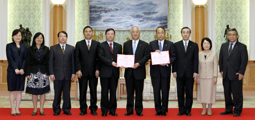 [사진] 지난 6월 8일 소카대학교 본관에서 평즈민 닝보대학교 부총장(왼쪽 다섰째) 일행이 이케다 SGI회장에게 ‘명예교수’, 가네코 여사에게 ‘명예원장’ 증서를 소카대학교 관계자에게 전달하고 기념촬영을 했다.