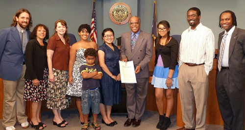 [사진] 미국 트래비스군이 지난 7월 6일, 오스틴에 있는 트래비스군청사에서 이케다 SGI 회장 부부에게 ‘명예군민’ 칭호를 수여했다. 비스코 군이사회 의장(왼쪽 일곱째)이 미국SGI 대표에게 증서를 전달했다.