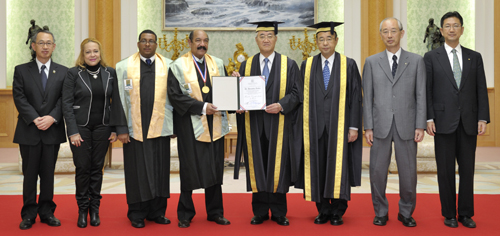 【도쿄】필리핀 국립 ‘서던민다나오대학교’가 지난 9일 도쿄 하치오지시 소카대학교 기념강당에서 소카대학교 창립자 이케다(池田) SGI 회장에게 ‘명예인문학박사’ 학위를 수여했다.