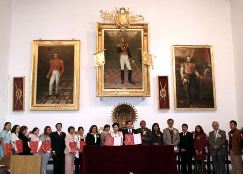 [사진] 지난 10월 8일 볼리비아 명소 ‘자유의 집’에서 마르티네스 수크레시의회 의장이 SGI 회장 대리인 다케노 이사장에게 증서와 메달을 전달했다. 또 베리오스시장은 가네코 부인 대리인 사사키 부인부장에게 증서와 메달을 건넸다.