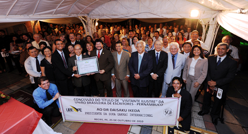 【종합】브라질 작가연맹 페르남 부쿠지부가 지난 10월 25일(현지시각) 페르남부쿠주 레시페시에서 작가와 인간주의 철학자의 업적을 기려 이케다(池田) SGI 회장에게 ‘국제빈객’ 칭호를 수여했다.
