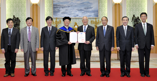 [사진]지난달 22일 소카대학교 본관에서 열린 수여식에서 타이완 후웨이과기대학교 린 총장(왼쪽 넷째)이 이케다 SGI 회장을 대리한 야마모토 소카대학교 총장(왼쪽 다섯째)에게 ‘명예공학박사’ 학위기를 전달했다.
